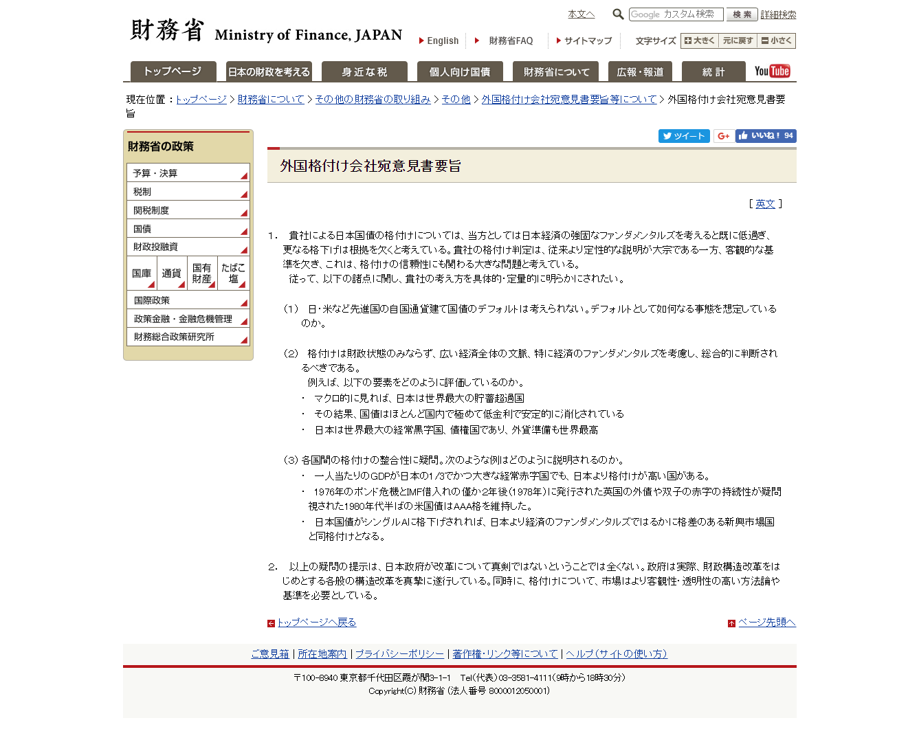1.貴社による日本国債の格付けについては、当方としては日本経済の強固なファンダメンタルズを考えると既に低過ぎ、更なる格下げは根拠を欠くと考えている。貴社の格付け判定は、従来より定性的な説明が大宗である一方、客観的な基準を欠き、これは、格付けの信頼性にも関わる大きな問題と考えている。