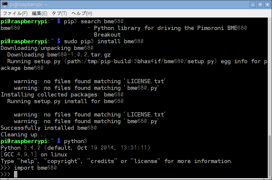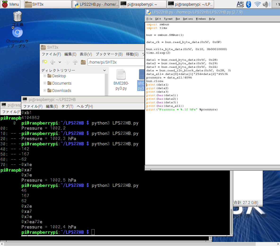 あとで かよっ!wimport smbusimport timebus = smbus.SMBus(1)data_ck = bus.read_byte_data(0x5C, 0x0F)bus.write_byte_data(0x5C, 0x10, 0b00010000)time.sleep(2)data1 = bus.read_byte_data(0x5C, 0x28)data2 = bus.read_byte_data(0x5C, 0x29)data3 = bus.read_byte_data(0x5C, 0x2A)data = bus.read_i2c_block_data(0x5C, 0x28, 3)data_all= data[0]+data[1]*256+data[2]*65536pressure = data_all/4096bus.closeprint(data1)print(data2)print(data3)print(hex(data1))print(hex(data2))print(hex(data3))print(hex(data_all))print("Pressure = %.1f hPa" %pressure)かなり実験的スクリプトなんで、見るとI2C接続のセンサーの使い方が